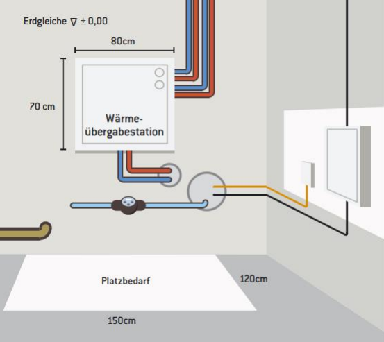 Sie benötigen in erster Linie nur eine Übergabestation in Ihrem Heizungsraum. Es sollte lediglich vom Kunden ein zusätzlicher Pufferspeicher für das Warmwasser vorgesehen werden. Somit sparen Sie sich unter anderem den Platz für einen Öltank oder ein Pelletlager.